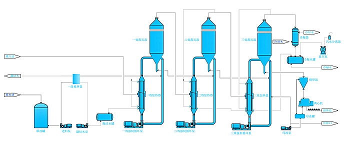 在多效蒸發器中,可將二次蒸器當作加熱蒸汽,引入另一個蒸發器,只要后者蒸發室壓力和溶液沸點均較原來蒸發器中的為低,則引入的二次蒸汽即能起加熱熱源的作用。同理,第二個蒸發器新產生的新的二次蒸汽又可作為第三蒸發器的加熱蒸汽。這樣,每一個蒸發器即為一效,將多個蒸發器連接起來一同操作,即組成一個多效蒸發系統。加入生蒸汽的蒸發器稱為第一效,利用第一效二次蒸汽加熱的成為第二效,依次類推。