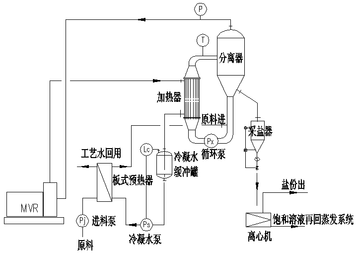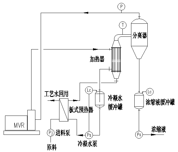 1、對于在蒸發(fā)過程中無結晶時,系統(tǒng)比較簡單,系統(tǒng)由預熱器、蒸發(fā)器(可以采用升膜式或降膜式)、分離器、MVR壓縮機和接收罐組成(如下圖)再配出料泵及控制部分,組成一套完整的MVR蒸發(fā)器系統(tǒng);蒸發(fā)可以是常壓或負壓,根據(jù)物料的特性而定,負壓蒸發(fā)時要考慮出料泵的汽蝕余量克服系統(tǒng)的真空。